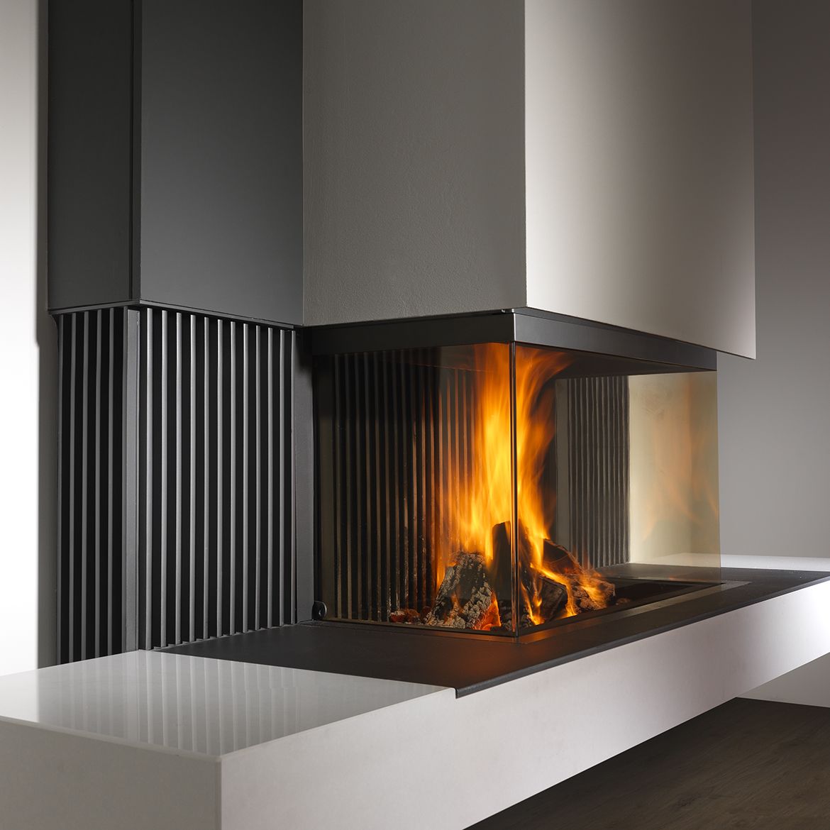 IBIZA est une cheminée à trois côtés vitrés offrant une large vision de feu à 180°.